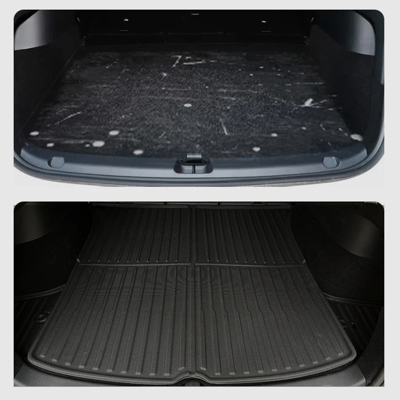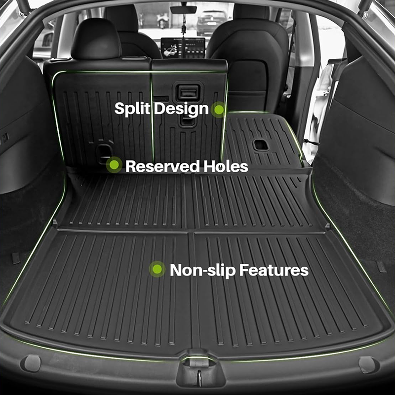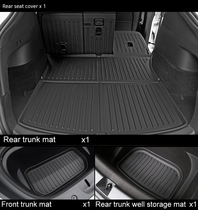 Komplet zaščitne TPE podloge prtljažnik in frunk Tesla Model Y Juniper 2025+ je zasnovan posebej za nove modele, kjer vsak detajl šteje. Paket vključuje podlogo za glavni prtljažnik, podlogo za sprednji prtljažnik (frunk) ter zaščitne stranice zadnjih sedežev. S tem zagotovite popolno zaščito notranjosti vozila pred umazanijo, vlago, praskami in razlitji.
